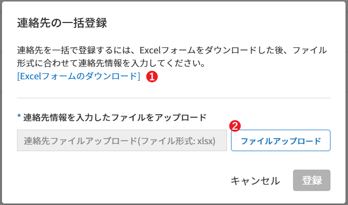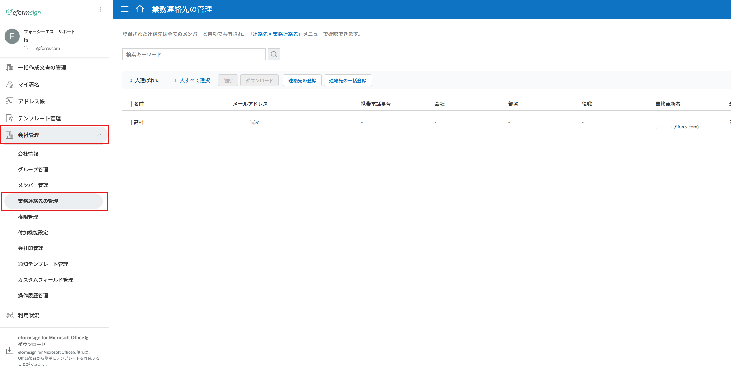 業務連絡先: 会社または代表管理者が登録した外部受信者の連絡先を確認できます。