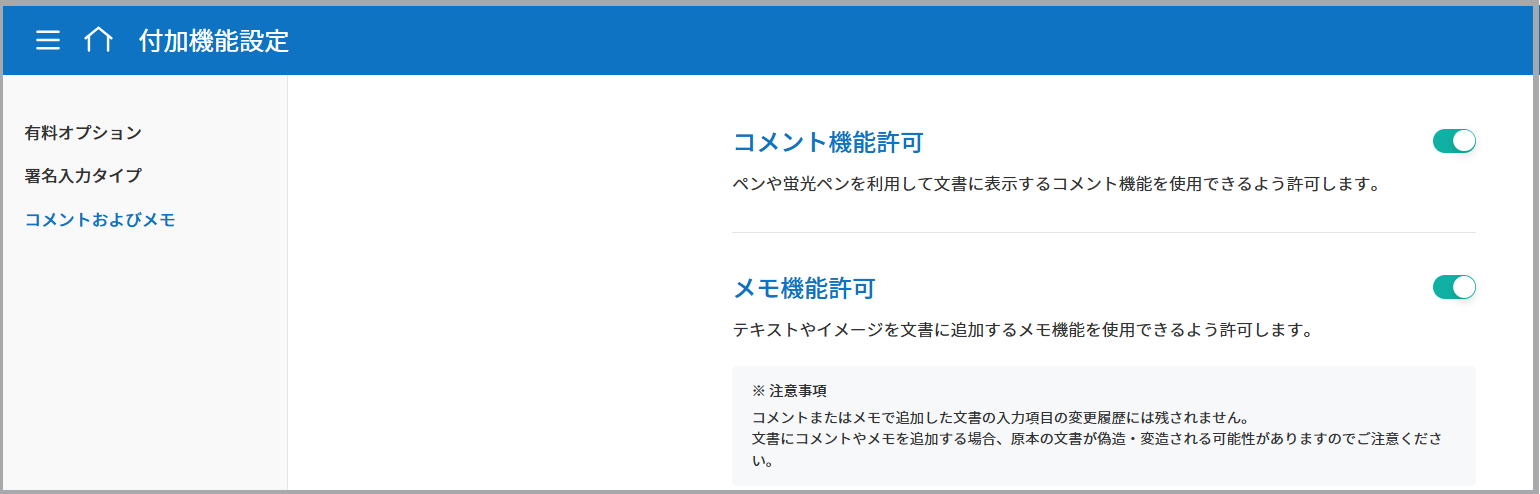 メモ機能許可: 文書にテキストや画像を追加できるメモ機能の使用を許可します。
