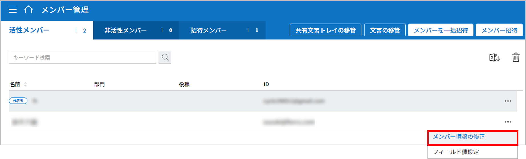 メンバー管理: メンバーを招待し、メンバー情報を修正することができます。