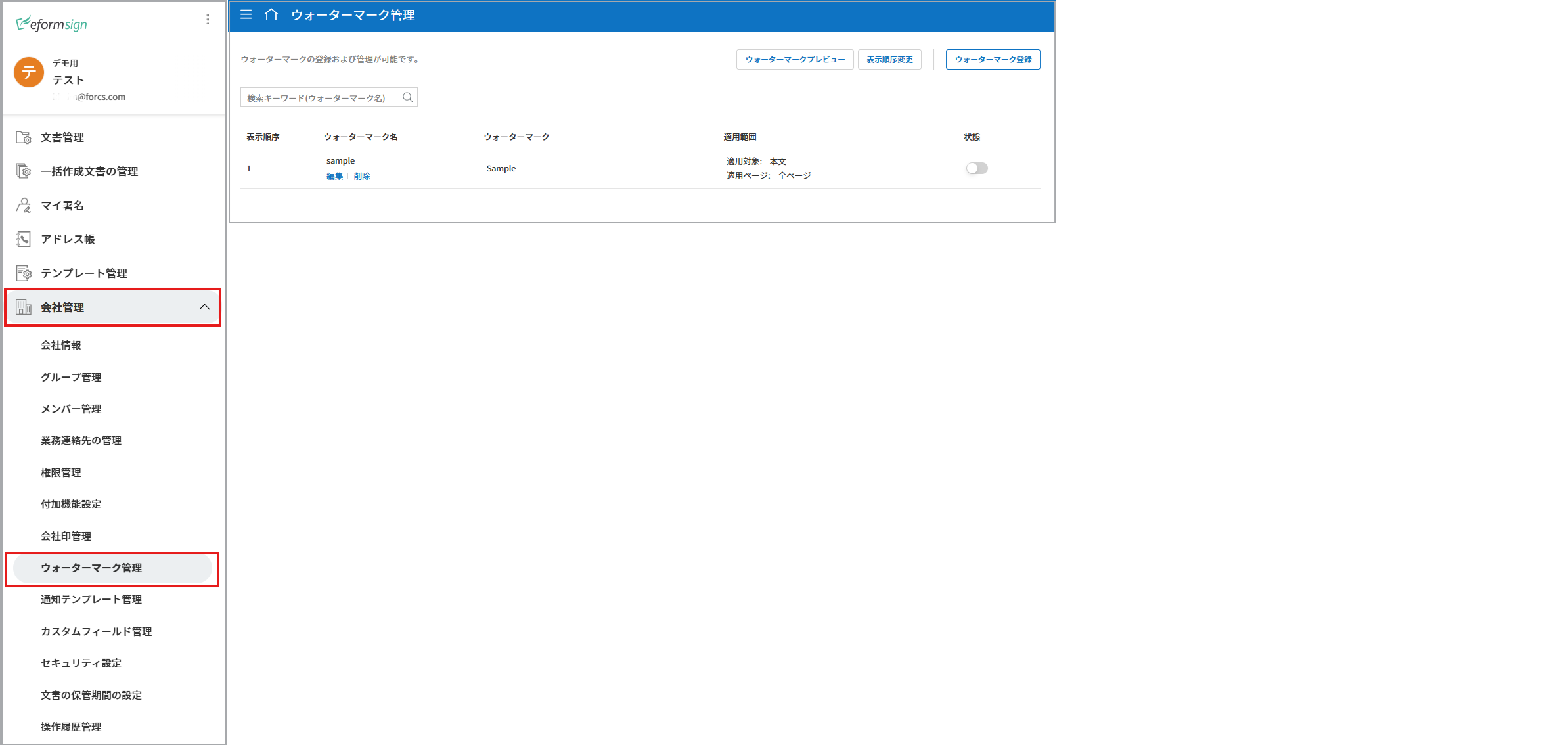 新しく登録したウォーターマークは、デフォルトで無効の状態で保存され、登録後に一覧でステータスを活性化すると すべての文書に適用されます。