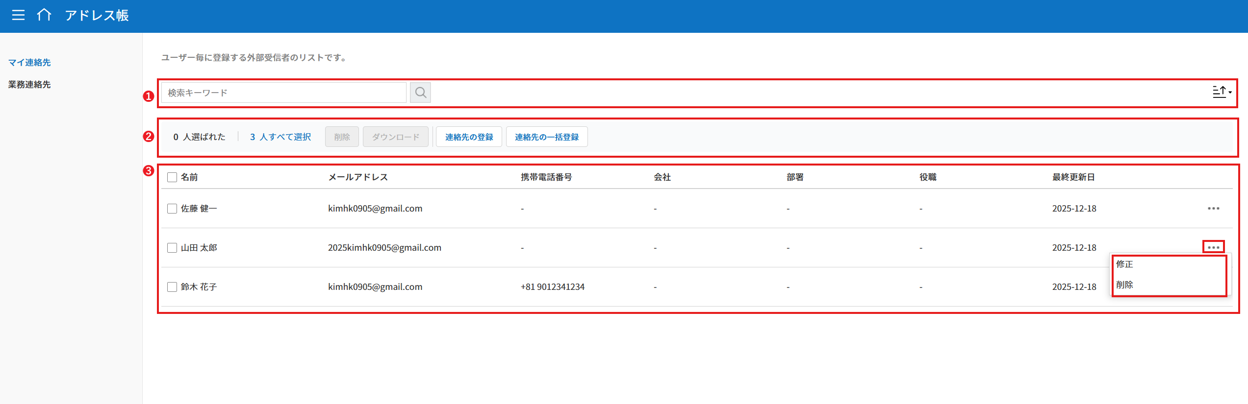 業務連絡先管理: 会社全体のメンバーと共有する外部受信者のアドレス帳を登録・管理できます。