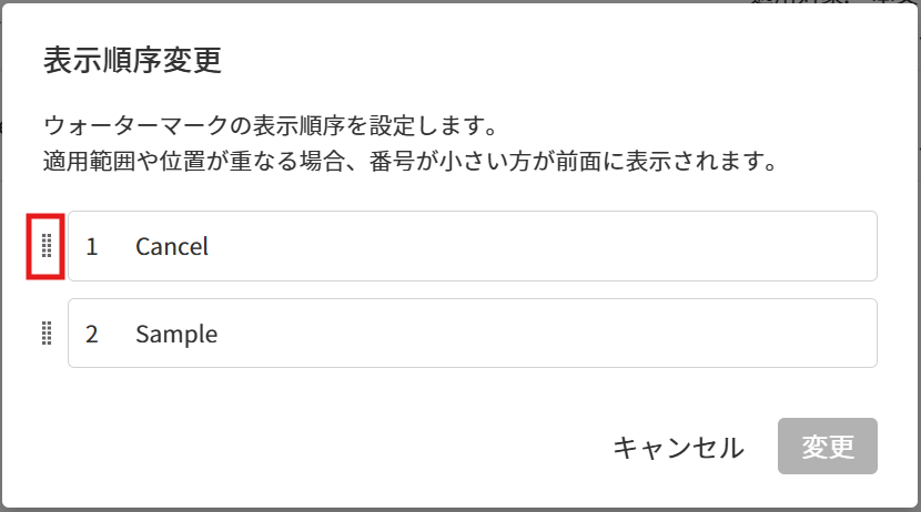 ウォーターマーク管理 画面右上の 表示順序変更 ボタンをクリック後、表示順序変更 ポップアップで、順序を変更したいウォーターマークをドラッグして位置を変更します。