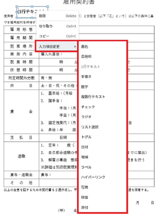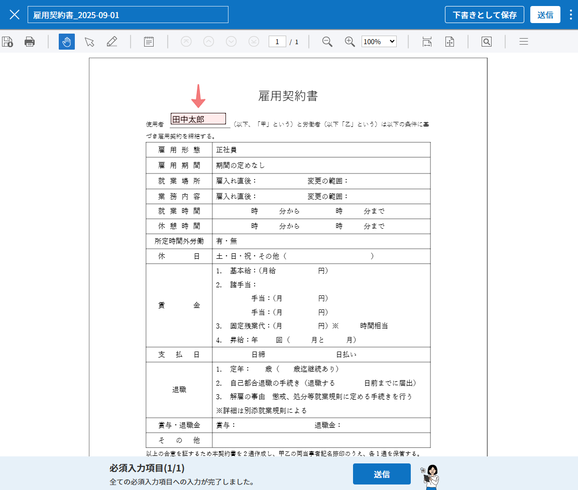 使用したい文書ファイルをアップロードし、文書上の任意の位置に入力項目を配置することができます。 また、各入力項目に参加者/検討者を割り当てることで、参加者/検討者の情報を入力してから送信できます。