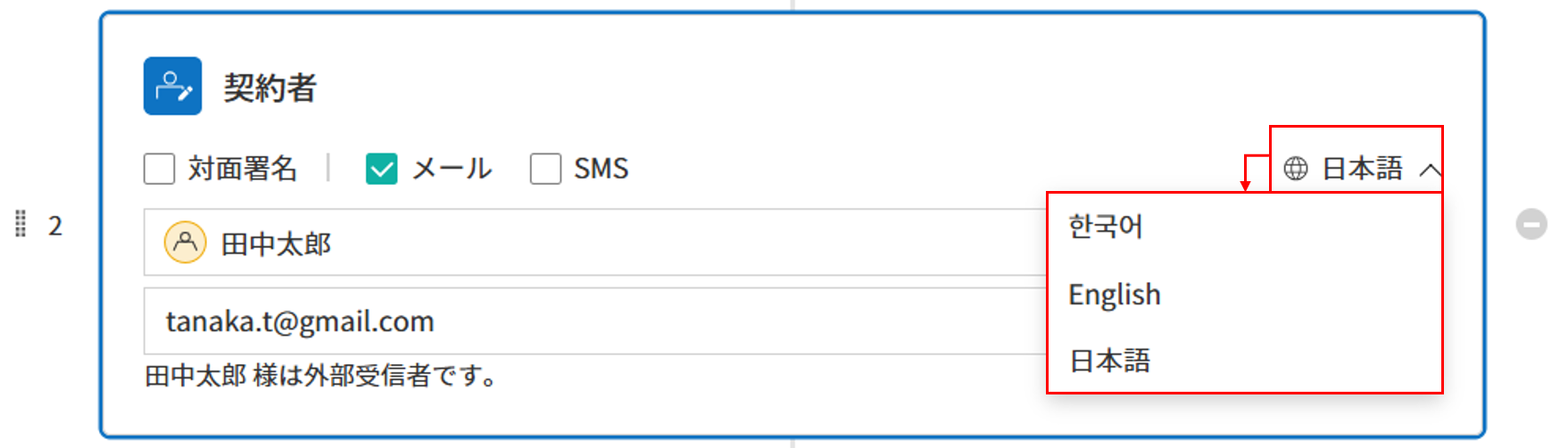 ❗ テンプレート管理 > テンプレートの設定 > ワークフローの設定で、各ワークフローのステップごと言語オプションを追加することができます。ここで設定した言語が 文書送信 ポップアップの言語選択オプションメニューに表示され、文書の送信時に受信者に送られる通知メッセージの言語を選択することができます。