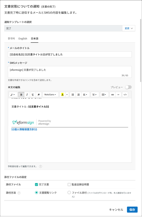 SMS: 文書の完了通知をSMSで送信する場合に、SMSで送信するメッセージを設定します。設定したメッセージと同時に文書を閲覧できるリンクが送信されます。