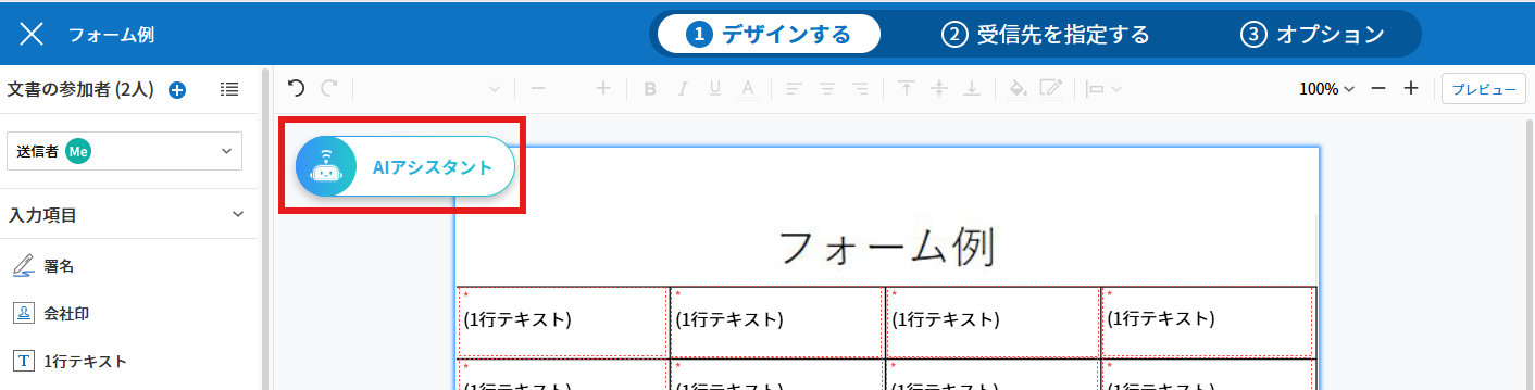 💡 AIアシスタントを使用すると、AIが文書を自動で分析し、入力項目の位置や種類を自動的に設定・配置します。