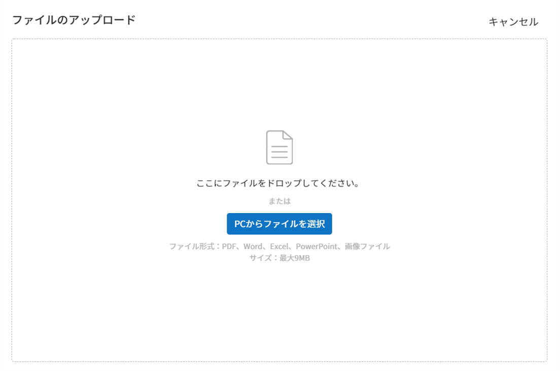 アップロード可能なファイル形式はpdf、doc、docx、xls、xlsx、ppt、pptx、odt、jpg、png、gif、tiffです。 アップロード可能なファイルの最大サイズ(合計)は9MBです。