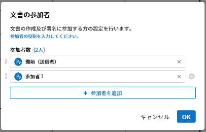 作成権限: 参加者ごとの、入力項目に入力できる権限を設定します。作成権限では、追加した参加者の一覧を表示し、割り当て対象・必須の設定をすることができます。文書送信時、割り当て対象に設定された入力項目は黄色に、必須に設定された入力項目は赤色で表示されます。