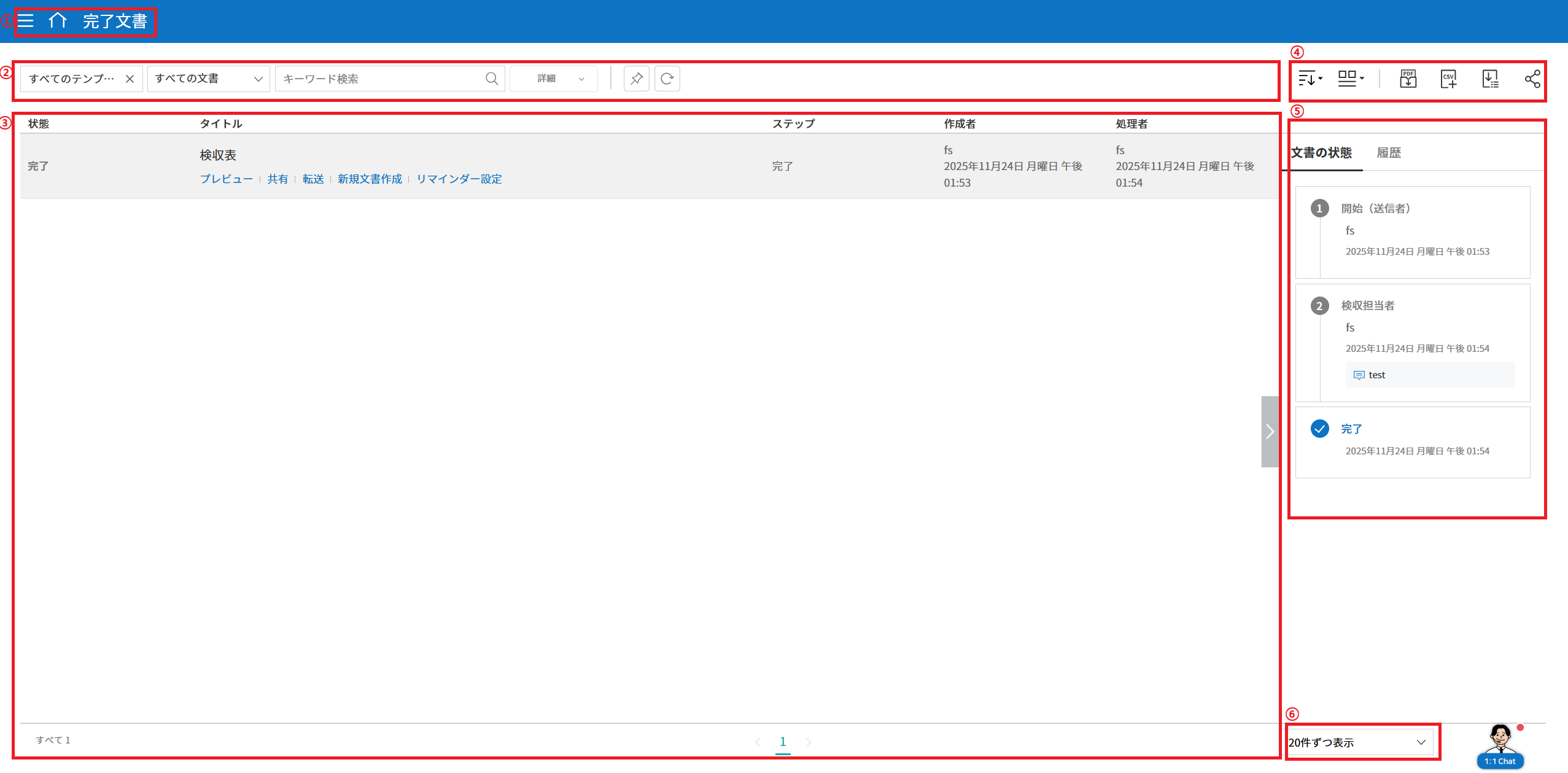 文書は、基本的に1ページあたり最大20件まで表示されます。 完了文書と 文書管理では、画面下部(⑥)にある1ページあたりの表示件数を選択することで、1ページに表示される文書数を変更できます。
